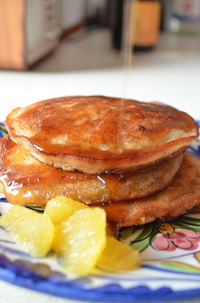 Servirajte palačinke tople, prelivene javorovim sirupom i uz sezonsko voće (maline, jagode, narandžu, bananu, itd.)