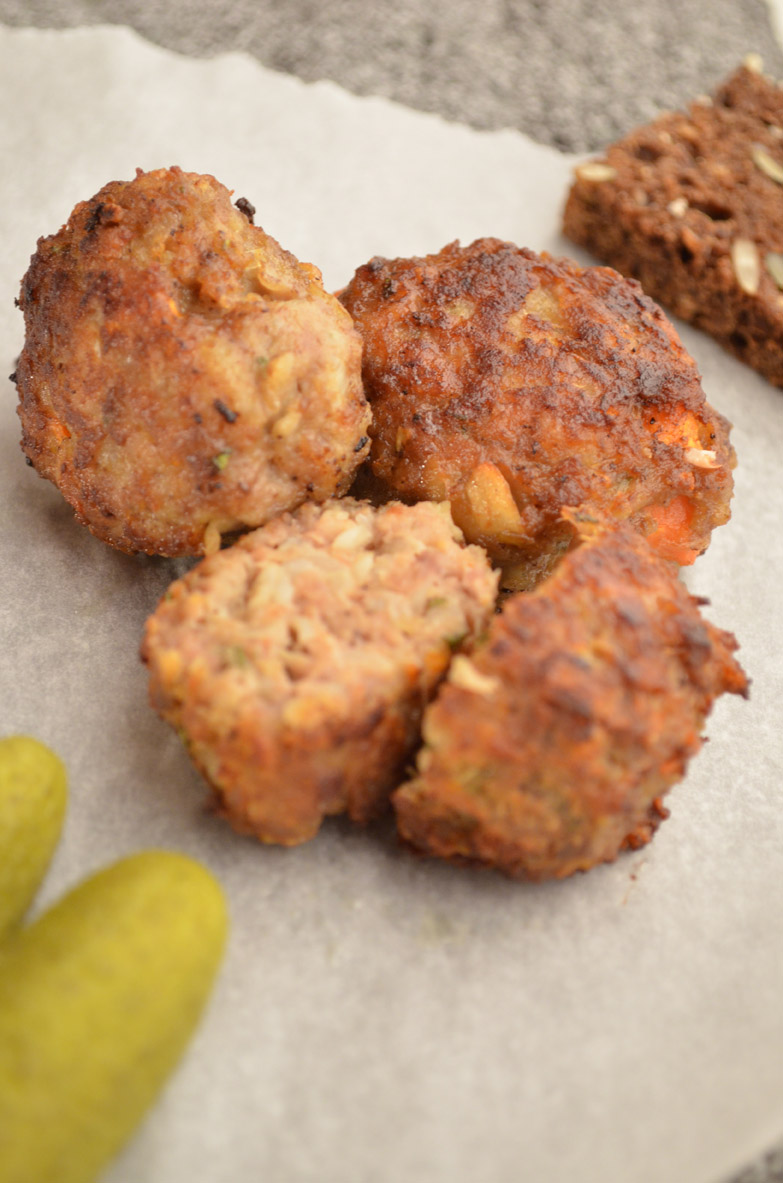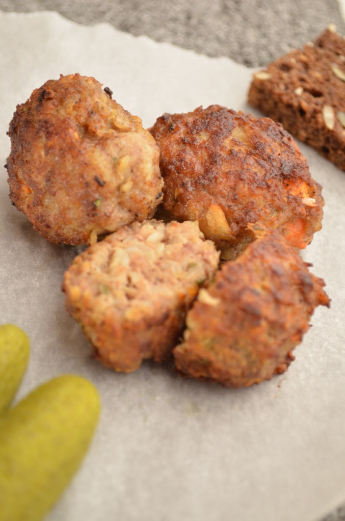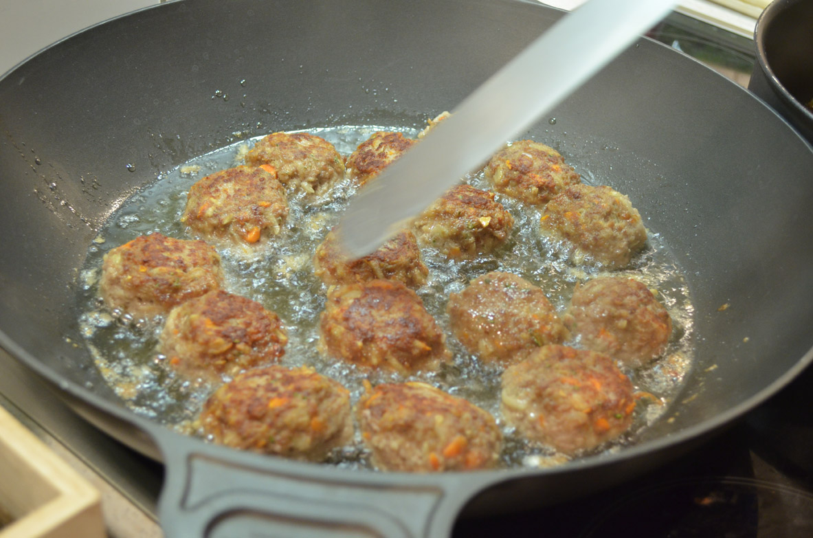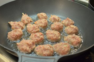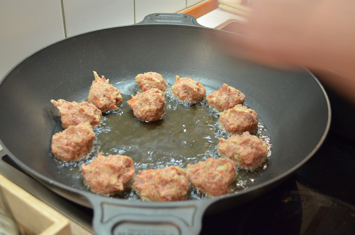 Prženje // Zagrijte puter i ulje na tavi. Sa dvije velike kašike oblikujte frikadele i spuštajte ih kašikom direktno u vrelo ulje. Oblik im ne mora biti potpuno okrugao. Pržite ih samo oko 2 minute sa svake strane dok ne dobiju rumenu koricu. Izvadite ih tako polupržene u vatrostalnu zdjelu i zapecite 10 minuta u rerni na 175 stepeni.