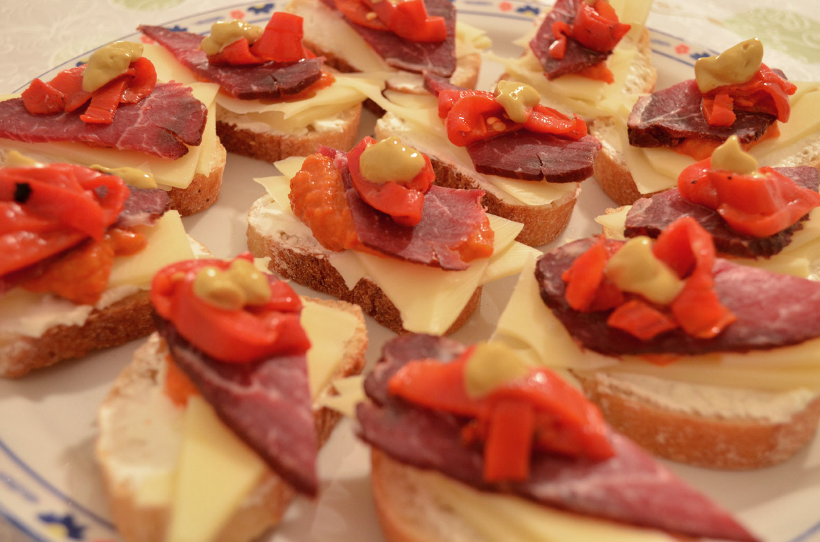 Priprema // Kriške hljeba premažite namazom od sira. Livanjski sir i suho meso izrežite na vrlo tanke kriškice. Na hljeb slažite: dvije kriške sira na koje stavite malu kašiku ajvara, potom dvije tanke kriške suhoga mesa i na vrh svega, tanku kriškicu pečene crvene paprike. Završite djelo sa ”tačkicom” senfa na kraju.