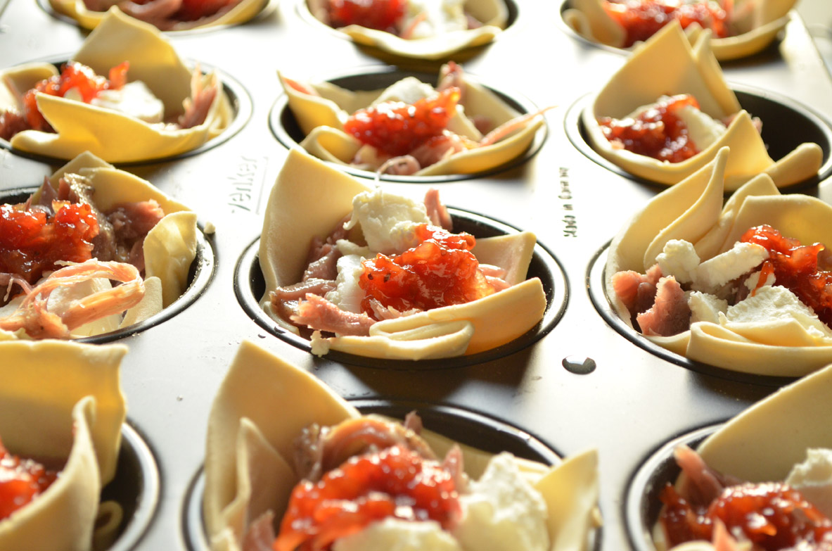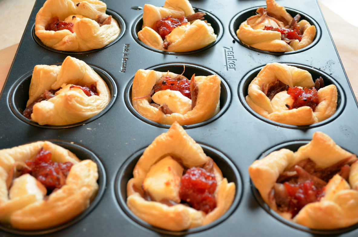 Sada stavljajte dovoljno confitiranih komadića pačijeg mesa (da napunite korpicu), zatim jedan komad kozijeg sira, i na kraju malu kašiku paradajz chutney-a. Količinu chutney-a možete sami da podešavate. On daje slatkastu notu korpicama i funkcioniše kao protuteža pačijem mesu i siru. Nemojte pretjerati sa chutney-om, jer će vam slatkoća preovladavati, što nije namjera sa ovim slanim korpicama od pačijeg mesa.