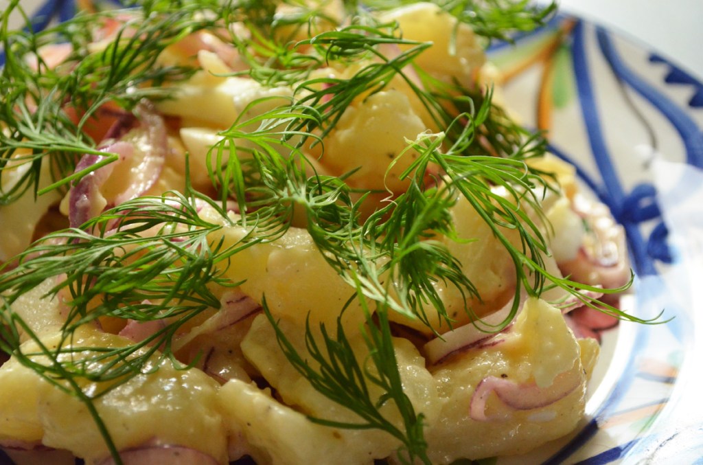 Jedan od onih priloga koji jednostavno odlično idu uz ribu, kao što je zapečena škarpina iz našeg predhodnog recepta, je naravno hladna krompir salata. Naša verzija je sa dosta svježeg kopra i dressingom od limunovog soka (umijesto sirćeta).
