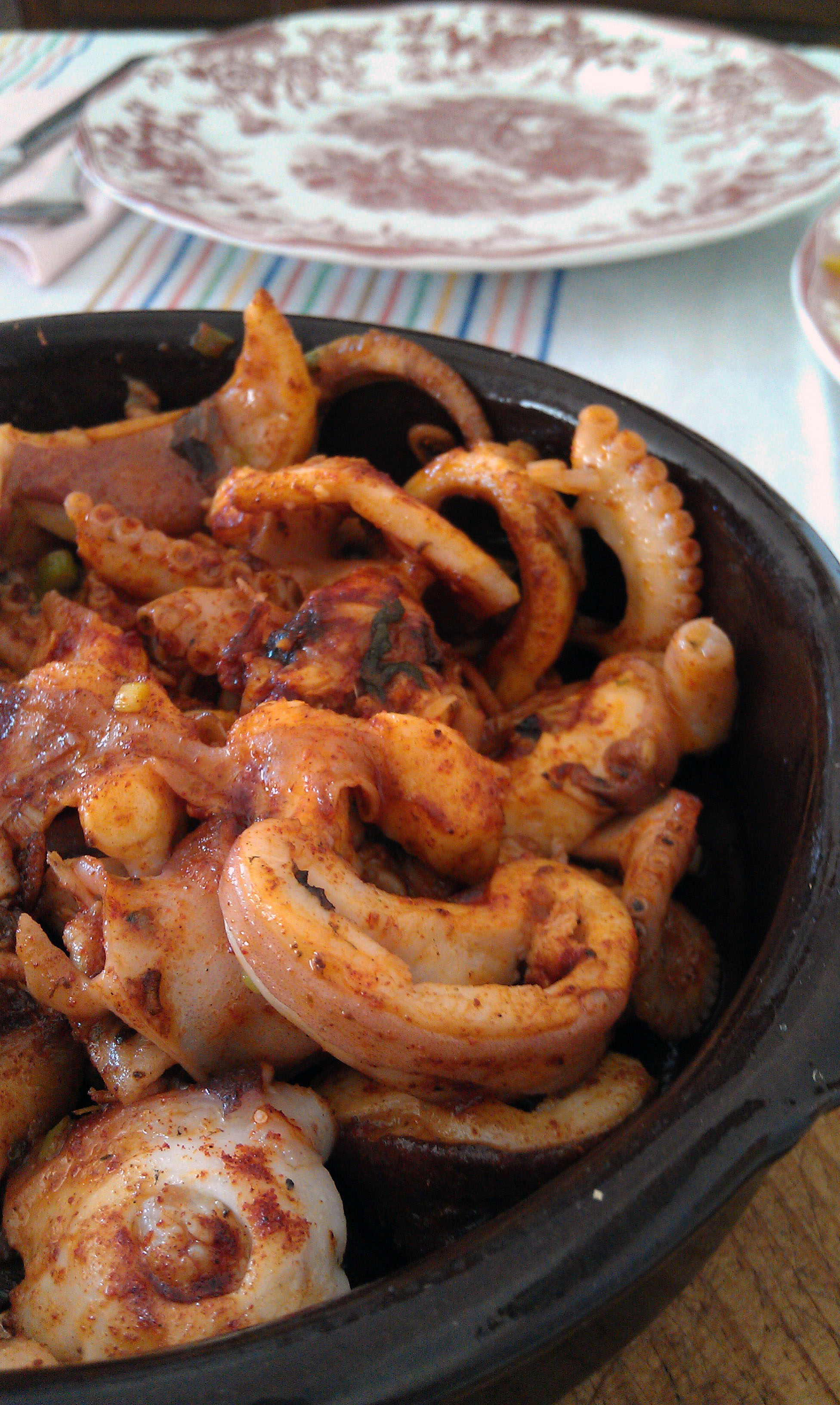 Pred samo serviranje, izrezane komadiće hobotnice propržite kratko (1-2 min.) na vrućem maslinovom ulju sa bijelim lukom – pazite da vam luk ne zagori, i slatkom i ljutom crvenom paprikom. Posolite i servirajte odmah u drvenoj ili zemljanoj posudi.