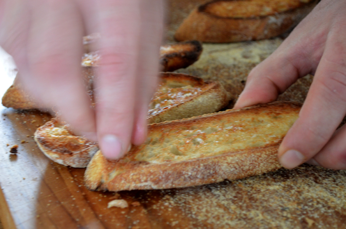 Bijeli luk dobro natrljajte po hrskavoj površini pečenog hljeba, ostavjajući tako aromu bijelog luka u bruschettama.