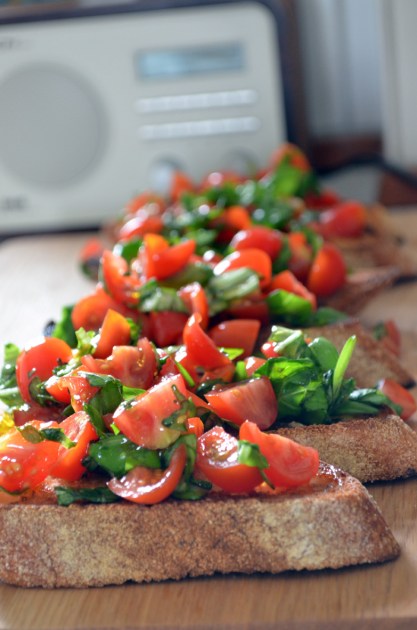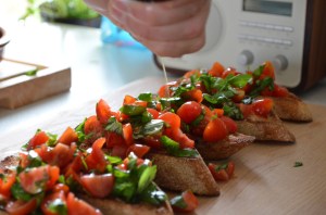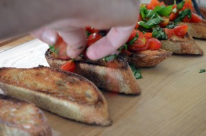 Rukama stavljajte hrpice paradajza i bosiljka na tople kriške pečenog hljeba.