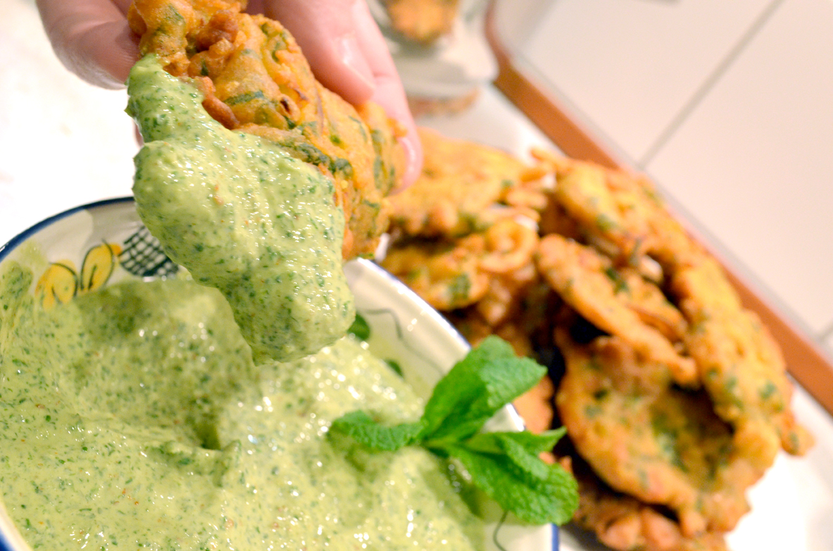 Indijski bhaji sa lukom i špinatom uz dip od nane i kojinadera